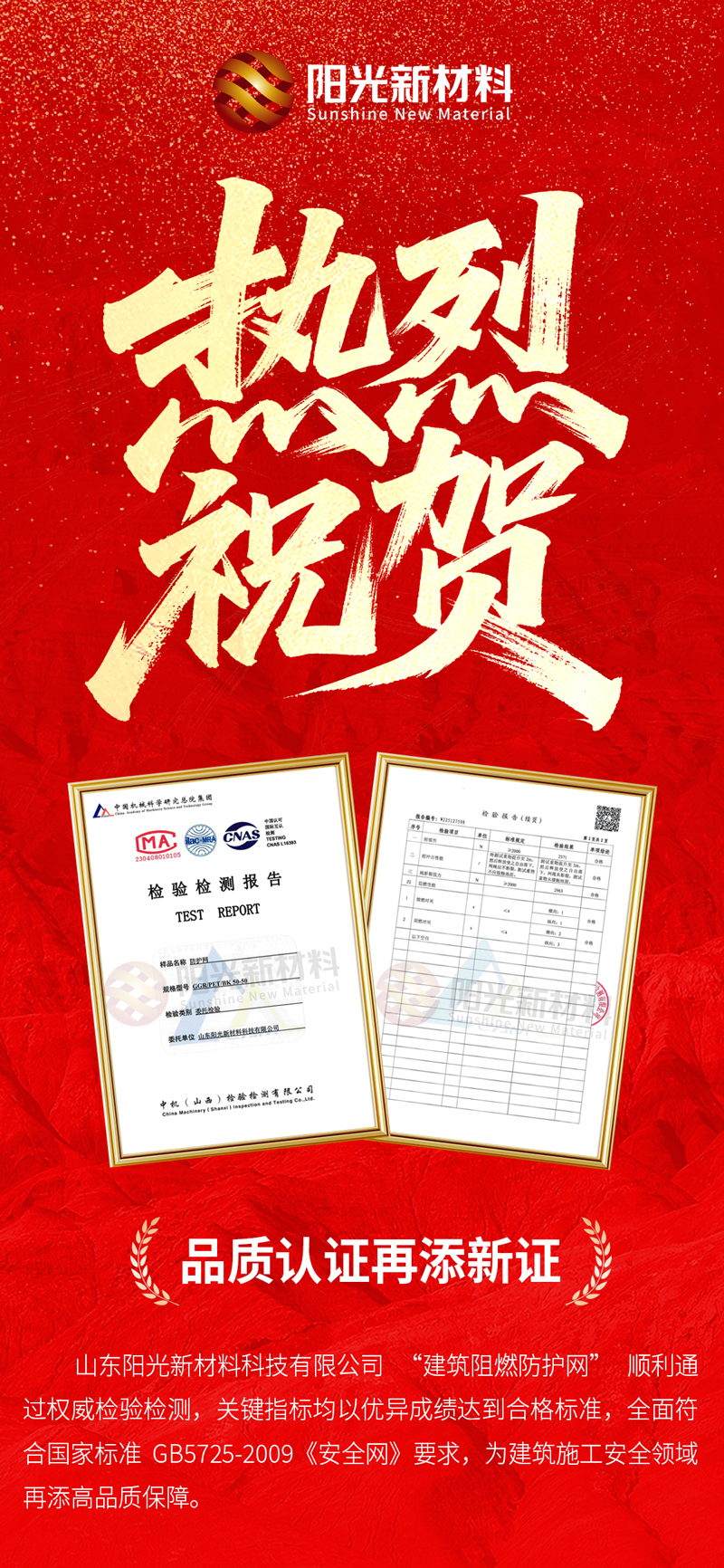 å“质认è¯å†æ·»æ–°è¯ï¼å±±ä¸œé˜³å…‰æ–°ææ–™å»ºç‘é˜»ç‡ƒé˜²æŠ¤ç½‘å¤šé¡¹æ ¸å¿ƒæŒ‡æ ‡è¾¾æ ‡ GB5725-2009