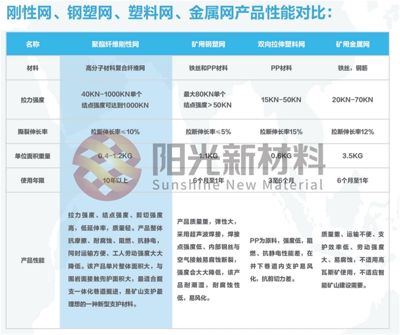 从性能上看,高强èšé…¯çº¤ç»´åˆšæ€§ç½‘çš„å¼ºåº¦è¡¨çŽ°å ªç§°å“越。æ¯å¹³æ–¹ç±³çš„æœ€å°æ‹‰åŠ›å¼ºåº¦å¯è¾¾40KN,最大拉力强度更是高达1200KN ï¼Œè€Œä¼ ç»Ÿé‡‘å±žç½‘çš„æ‹‰åŠ›å¼ºåº¦é€šå¸¸åªæœ‰35KNå·¦å³ã€‚如æ¤å¼ºå¤§çš„æ‹‰åŠ›å¼ºåº¦ï¼Œä½¿å¾—å®ƒåœ¨æ‰¿å—巨大压力和冲击力时,ä¾ç„¶èƒ½å¤Ÿä¿æŒç»“构的稳定,为工程æä¾›å¯é çš„é˜²æŠ¤ã€‚æ— è®ºæ˜¯åœ¨çŸ¿å±±å··é“䏿е御顶æ¿çš„压力,还是在隧é“å·¥ç¨‹ä¸æ‰¿å—围岩的形å˜ï¼Œé«˜å¼ºèšé…¯çº¤ç»´åˆšæ€§ç½‘都能游刃有余。