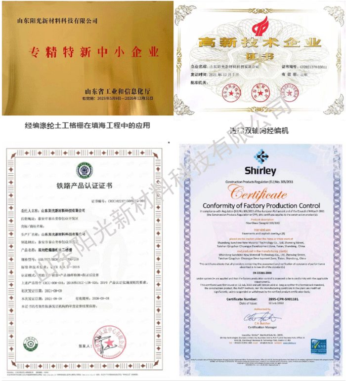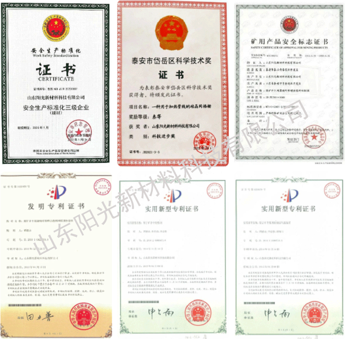 公叿˜¯å±±ä¸œçœâ€œä¸“精特新â€ä¸å°ä¼ä¸šã€å±±ä¸œçœé«˜æ–°æŠ€æœ¯ä¼ä¸šã€ç§‘技型ä¸å°ä¼ä¸šã€å®‰å…¨ç”Ÿäº§æ ‡å‡†åŒ–三级ä¼ä¸šï¼Œã€Šä¸€ç§åŠ çƒç®¡çº¿çš„ç¡…æ™¶ç½‘æ ¼æ …ã€‹é¡¹ç›®èŽ·æ³°å®‰å¸‚å²±å²³åŒºç§‘å¦è¿›æ¥å¥–,煤矿井下用èšé…¯çº¤ç»´å¢žå¼ºå¡‘料网å‡é¡¶èŽ·çŸ¿ç”¨äº§å“å®‰å…¨æ ‡å¿—è¯ä¹¦ï¼Œæ‹¥æœ‰å¤šé¡¹å‘明和实用新型专利。公å¸äº§å“通过了ISO 9001è´¨é‡ç®¡ç†ä½“系认è¯ã€ISO 14001环境管ç†ä½“系认è¯ã€ISO 45001èŒä¸šå¥åº·å®‰å…¨ç®¡ç†ä½“系认è¯ã€æ¬§ç›Ÿcpr认è¯åŠCRCCé“路体系认è¯ã€‚