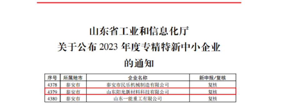 近日,山东çœå·¥ä¸šå’Œä¿¡æ¯åŒ–厅å‘布《关于公布2023年度专精特新ä¸å°ä¼ä¸šçš„通知》(é²å·¥ä¿¡åˆ›ã€”2023〕78å·ï¼‰ï¼Œä¸å›½åœŸå·¥åˆæˆææ–™å·¥ç¨‹å会会员å•ä½å±±ä¸œé˜³å…‰æ–°ææ–™ç§‘技有é™å…¬å¸é€šè¿‡å¤æ ¸ã€‚