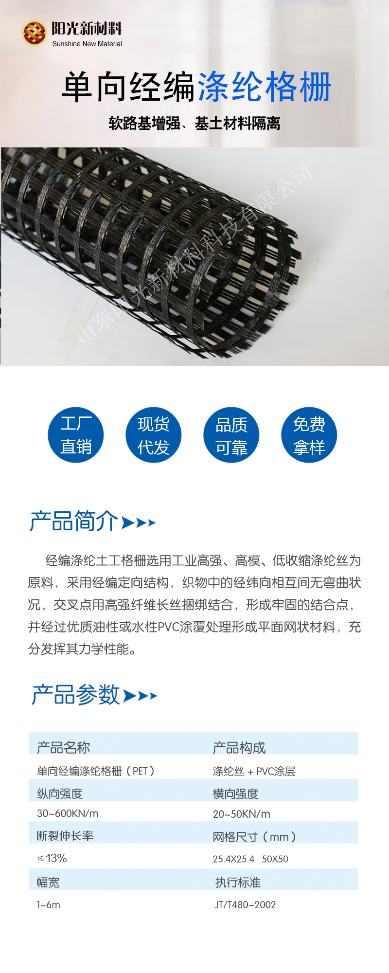 山东阳光新材料经编涤纶土工格栅凭借其出色的性能和广泛的适用性,在各类工程建设中扮演着不可或缺的角色。随着工程技术的不断发展,相信经编涤纶土工格栅将在未来的基础设施建设中发挥更大作用,为我们打造更加稳固、安全的生活环境。